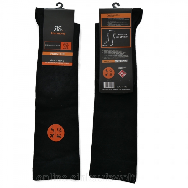 2 Paar Stützstrümpfe schwarz in Größe 35-38 / 39-42 / 43-46 für Damen und Herren. Die Reisestrümpfe und Kompressionsstrümpfe in schwarz mit handgekettelter Spitze ohne Naht beugen Thrombose vor und sind genau das Richtige für lange Flüge und langes sitzen im Büro. Der Stützverlauf verbessert und beschleunigt die Durchblutung und die handgekettelte weiche Fußspitze verhindert Druckstellen. Versandkostenfrei innerhalb Deutschlands. Artikelnummer RS44450