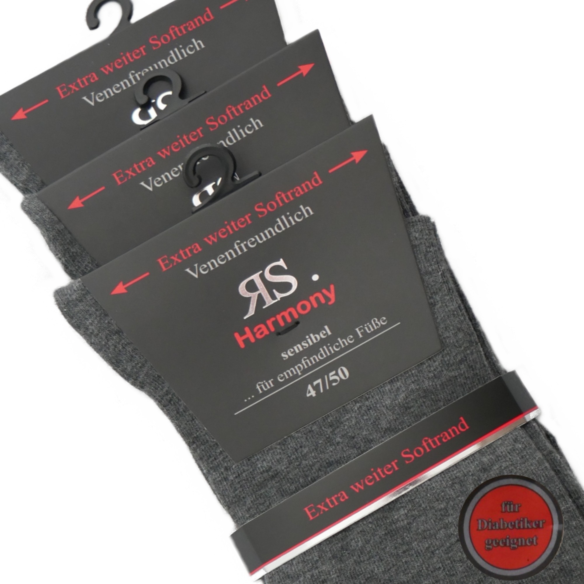 3 Paar Socken extra weit Größe 47-50 Herrensocken mit Softrand in Anthrazit. Hochwertige Harmony Quality Herrensocken ohne Gummibund mit extra feiner Maschenqualität verzichtet auf jedes Gummi bei bestmöglichem Halt ohne einzuschnüren. Die innovative Funktionsfaser Sorbotek® nimmt Feuchtigkeit auf, leitet sie ab und sorgt für eine schnelle Verdunstung. Fazit: Der extra weite Softrand ohne Druck im Wadenbereich, die handgekettelte Fußspitze und die verstärkte Spitze und Ferse sorgen für eine angenehme Trageeigenschaft. Versandkostenfrei innerhalb Deutschlands. Artikelnummer RS31034A